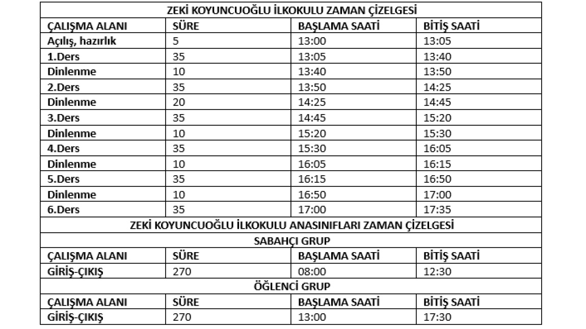 01/09/2025 tarih ve 139238295 sayılı Bakanlığımız emirleri doğrultusunda 2025-2026 Eğitim ve Öğretim yılında okulumuz paydaşlarıyla ders saati süreleri 35 dakika olarak belirlenmiştir.Zaman çizelgesi 08/09/2025 gününden itibaren uygulanacaktır.Bilginize...